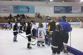 Das letzte Eistraining der Saison war zeitgleich das letzte Training in der q.beyond Arena (vormals Voba) und damit Grund genug aus dem Training eine gemeinsame Eiszeit aller Nachwuchsteams zusammenzulegen, Spiel und Spaß in den Vordergrund zu stellen und gemeinsam noch mal eine gute Zeit auf dem Eis zu haben. Nicht ganz uneigennützig freuten sich die Trainer, genau wie einige mutige Eltern, gegen und mit den Kindern zu zocken. Abgerundet von einem kleinen Buffet und Snacks für die Kinder konnte so die nostalgisch letzte Eiszeit in dieser Halle begangen werden.